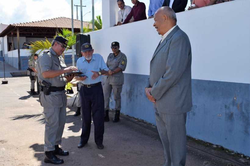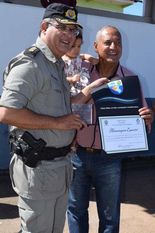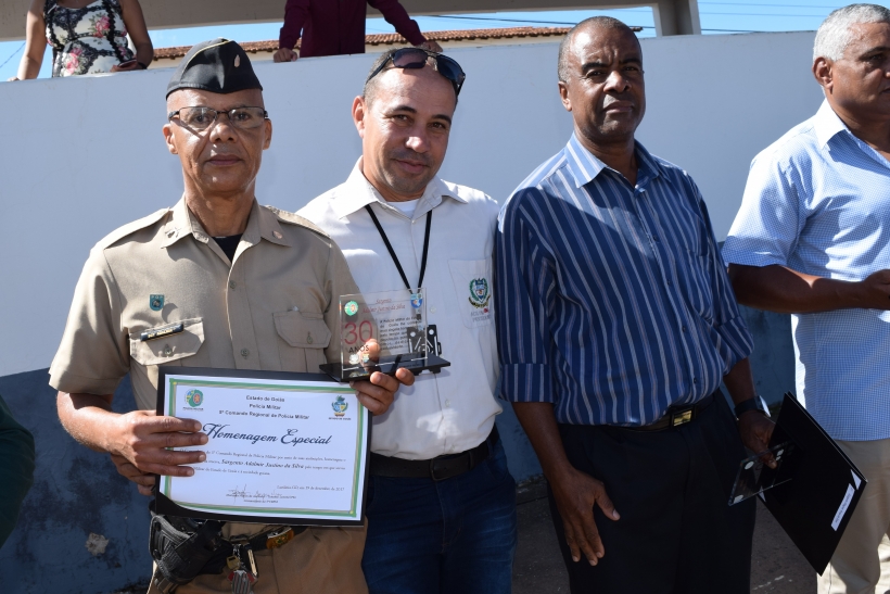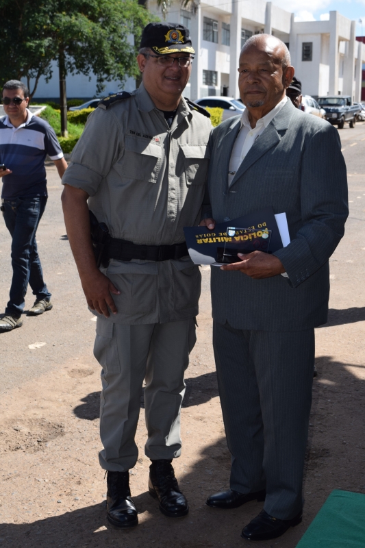 Dessa vez o Sargento José Pessoa de Melo, 83 anos, conhecido por Sargento Gabiroba e reformado desde 1984, pode entregar a homenagem a outro decano da PM na região do entorno: o Sargento Julião. Este ficou muito feliz em receber das mãos de seu contemporâneo o diploma de reconhecimento pelos serviços prestados à sociedade goiana.